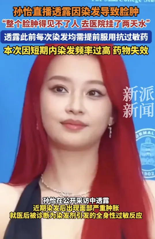 近日,演员孙怡在直播中的一番言论引发广泛热议。她自曝因染发导致脸部严重肿胀,不仅需要前往医院连续挂水两天,甚至到了 “见不了人” 的地步。孙怡坦言,自己本身就对染发膏过敏,以往每次染发前都会提前服用过敏药,但此次因染发次数过于频繁,过敏药也失去了效果,这让她下定决心 “再也不染了”。