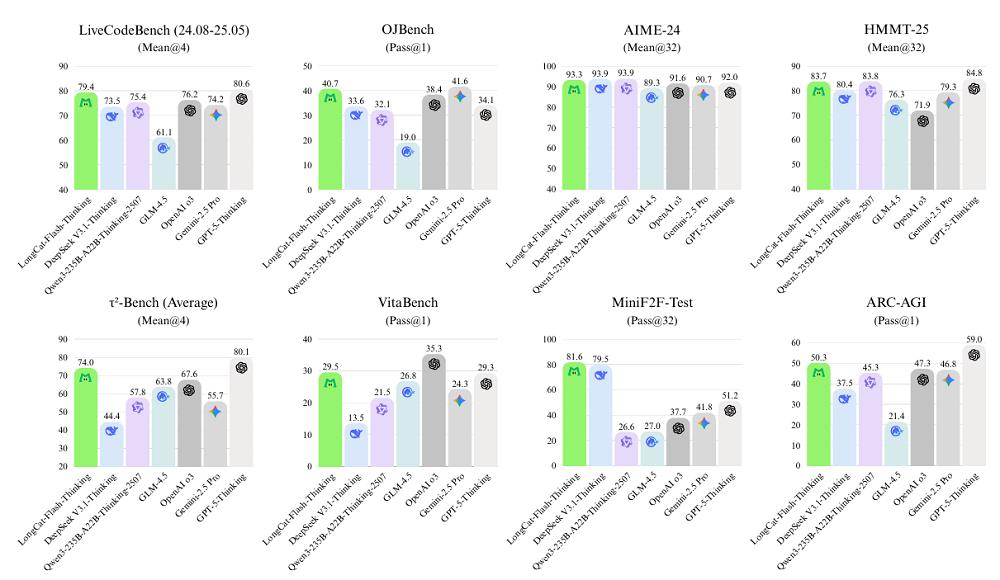 LongCat-Flash-Thinking 具备卓越的通用推理能力,尤其在需要结构化逻辑的任务中表现突出。其在 ARC-AGI 基准测试中以 50.3 分超越 OpenAI o3、Gemini2.5 Pro 等顶尖闭源模型。