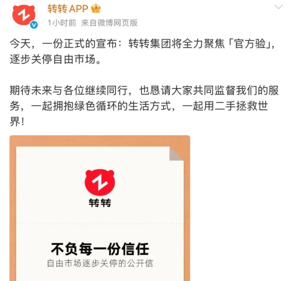 记者从转转官方获悉,公司将彻底关停 “自由市场” (C2C)功能,全面转向 C2B2C 模式,C2C 业务将从 9 月 22 日起逐步关停。
