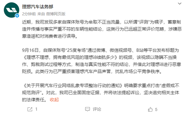 9 月 23 日,理想汽车法务部的一纸声明打破了新能源汽车圈的平静。这份直指 “多家自媒体恶意造谣” 的公告中,账号 “25 度考场” 成为首个被点名的对象 —— 其 9 月 16 日发布的《理想不理想,拥有最低风阻的理想 i8 续航多少》视频,被指通过 “隐瞒操作、剪裁过程” 制造虚假结论,对理想 i8 实施恶意贬损。