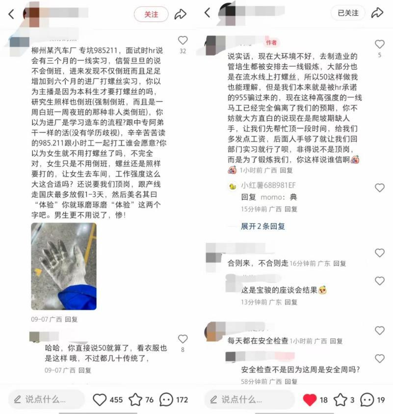 “入职第一天就懵了,穿着工装站在流水线前,手里拿的不是方案文档,而是螺丝刀。” 一位不愿具名的 985 管培生回忆,校招时五菱的宣讲会充满吸引力 ——“作为制造型企业,一线锻炼是基础,但最长不超过 3 个月,后续会根据专业和能力定岗到研发、管理岗位”,HR 口中的 “955 工作制”“完善的培养体系”,让他放弃了其他 offer 选择了五菱。