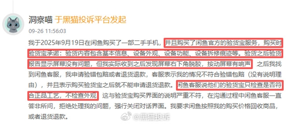 9 月 26 日,一则关于闲鱼 “验货宝” 服务的投诉在消费者群体中引发广泛关注。有消费者向黑猫投诉平台反映,其在闲鱼平台购买二手手机时,特意选择了平台主推的 “验货宝” 检测服务,本以为经过 80 道检测项的严格把关,能买到放心的二手设备,可收货后却发现手机存在屏幕右下角脱胶、按压有响声等明显问题。更让消费者不满的是,“验货宝” 出具的检测报告中并未提示屏幕存在任何异常,而当他向闲鱼客服反馈情况时,得到的回应竟是 “验货宝仅验正品工艺,不检外观”,且平台拒绝为其办理退款。